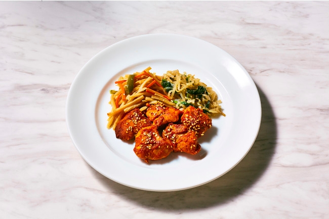 コチュジャンの効いた甘辛のタレはチキンとの相性が抜群です。副菜はたけのこと野菜のオイスターソース炒めとほうれん草ともやしのナムル。さわやかな唐辛子の香りとコクのあるごま油の香りで箸が止まらなくなってしまうかも。