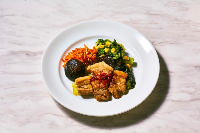ジューシーな豚のバラ肉を昆布と干し椎茸の旨味たっぷりの出汁を含ませて角煮に仕上げました。厚切りのお肉はボリューム満点です。副菜はブロッコリーとコーンの中華和えと、沖縄の郷土料理でおなじみ、にんじんしりしり(にんじんとツナの炒め物)。彩り鮮やかなメニューをお召し上がりください。