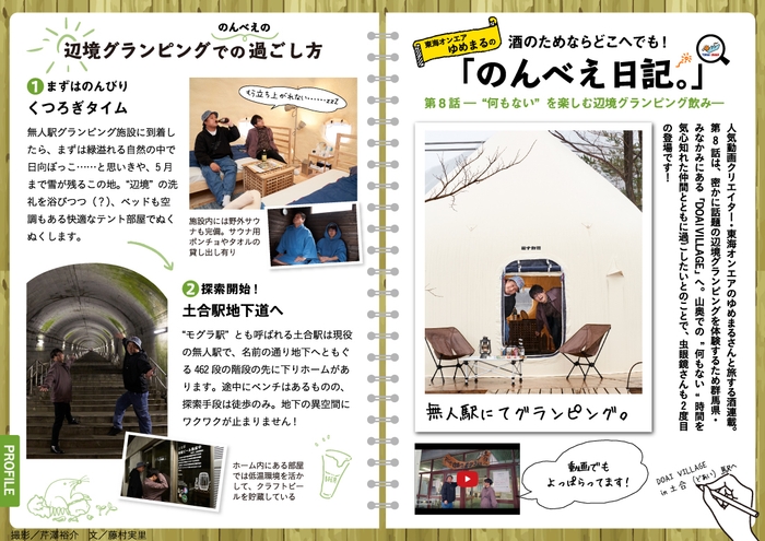 YouTubeチャンネルの登録者数が580万人を突破した「東海オンエア」。そんな人気動画クリエイターグループのメンバーであり、無類の酒好きとして知られるゆめまるさんの酒連載第8話。今回は、密かに話題の辺境グランピングを体験するため、群馬県・みなかみにある「DOAI VILLAGE」へ。山奥での“何もない”時間を気心知れた仲間とともに過ごしたいとのことで、虫眼鏡さんも2度目の登場です! 地下道探検や、クラフトビール片手に「缶つま」を使ったおつまみ作りをするほろ酔いなお二人の様子は動画でも楽しめます。