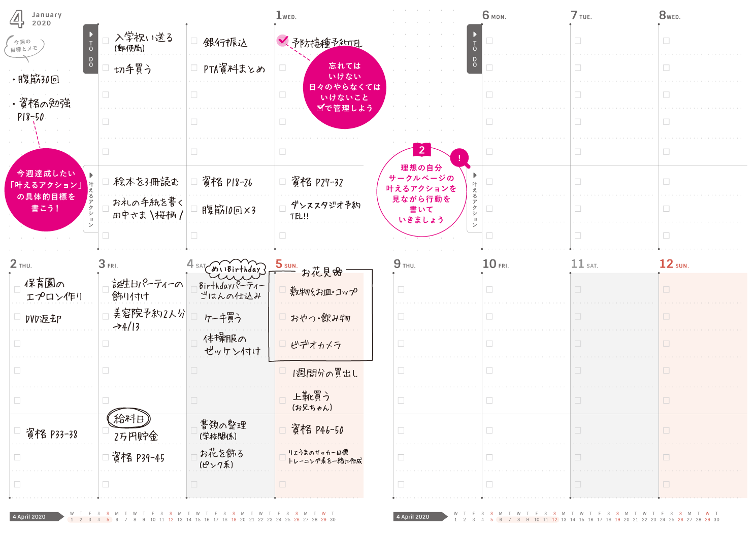理想の自分サークル、叶えるアクション欄付きウイークリー、
