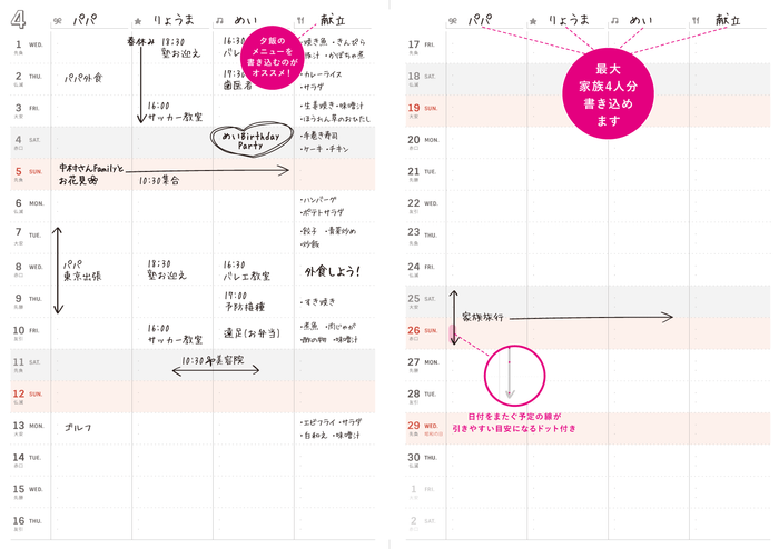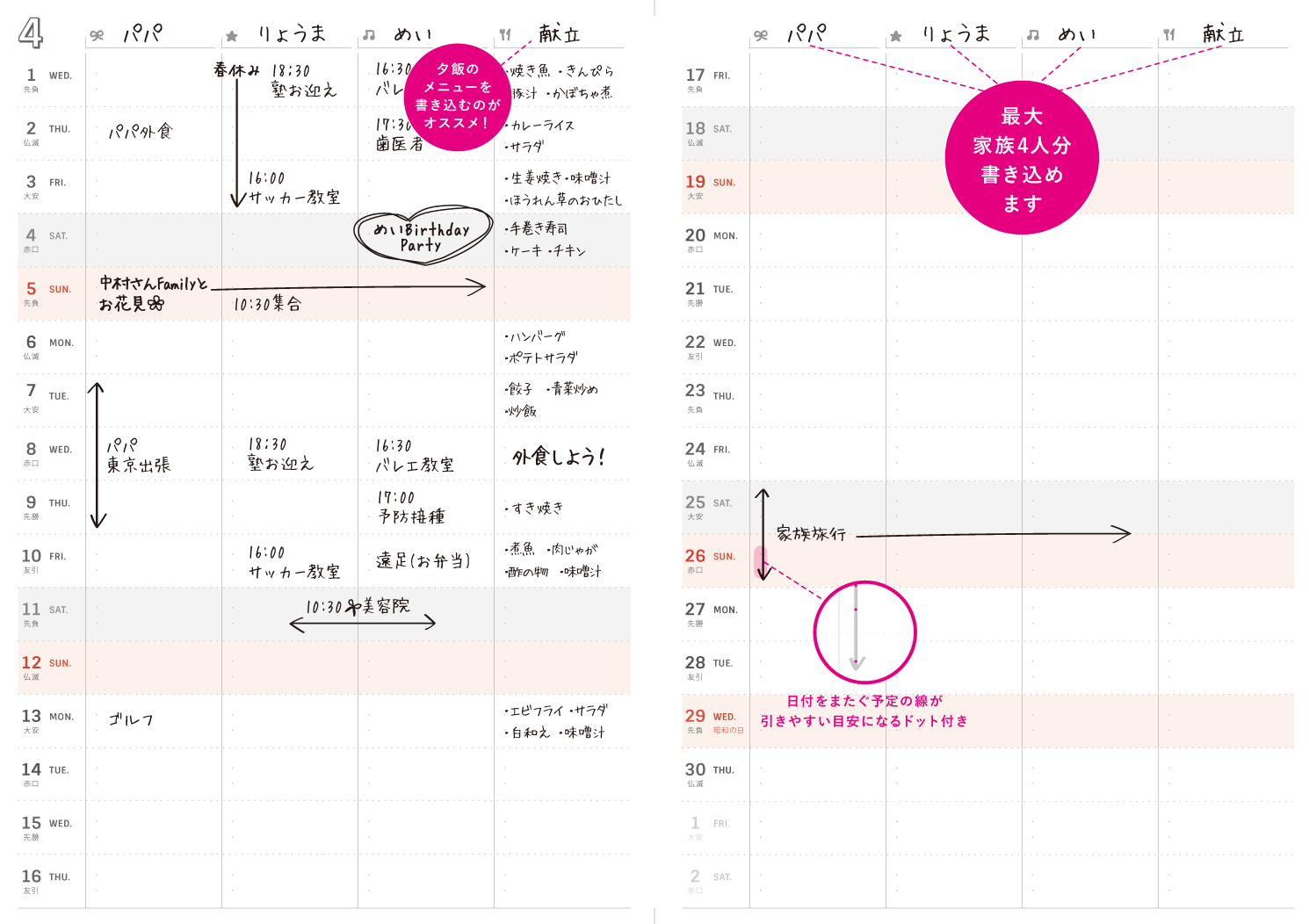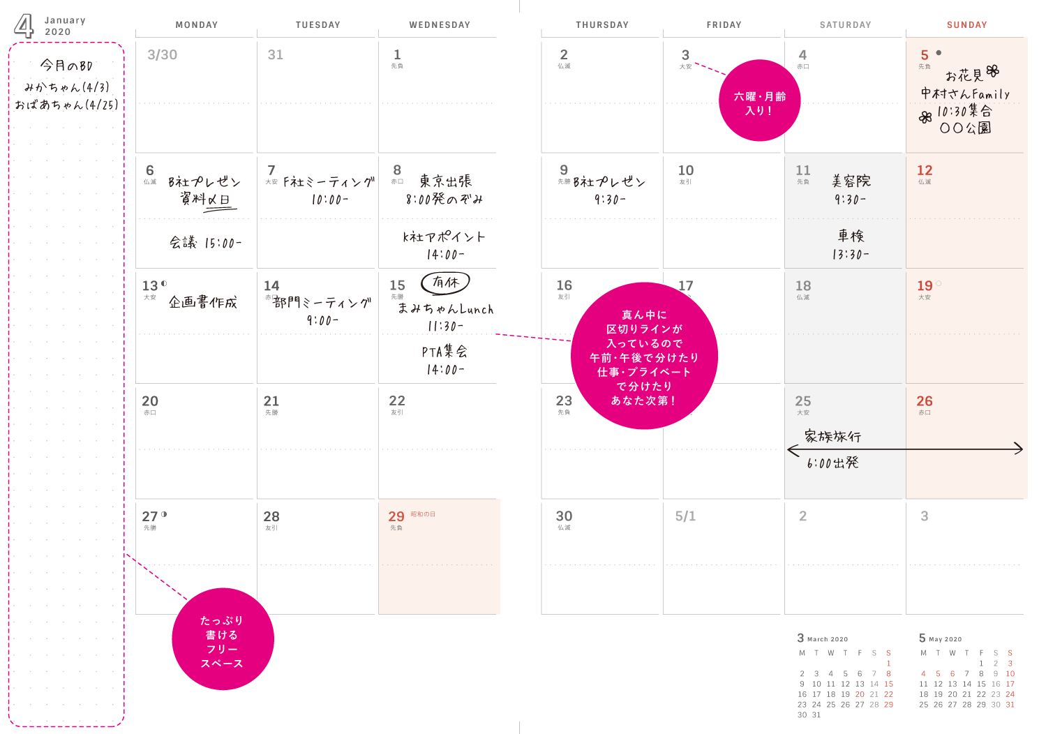 ページ構成:年間スケジュール、マンスリー(六曜あり・月齢あり)、