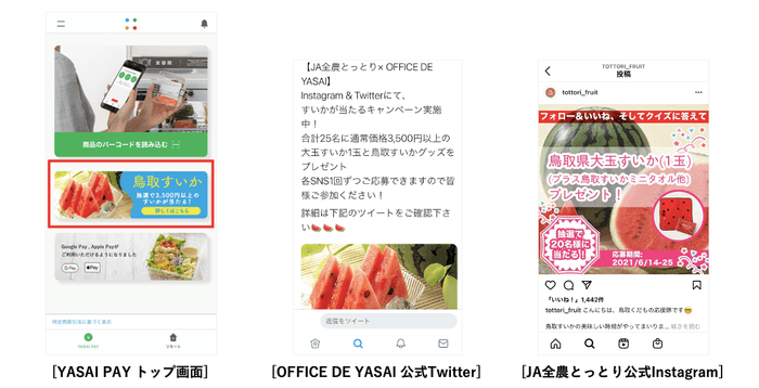 今回のサンプリングでは、実際に食べていただくことで「鳥取すいか」の美味しさを伝えるほか、認知の拡大を目的にSNSのTwitterとInstagramを活用し、「鳥取大玉すいかが25名様に当たるキャンペーン」を実施いたしました。