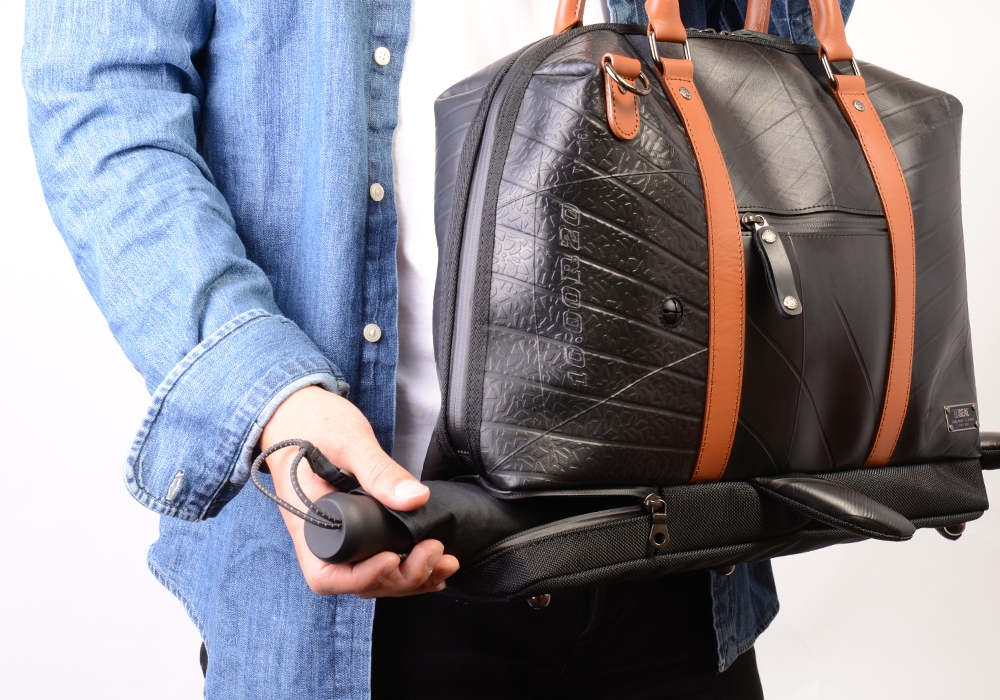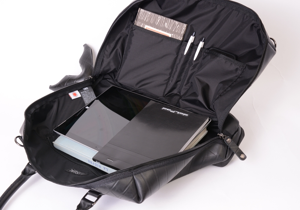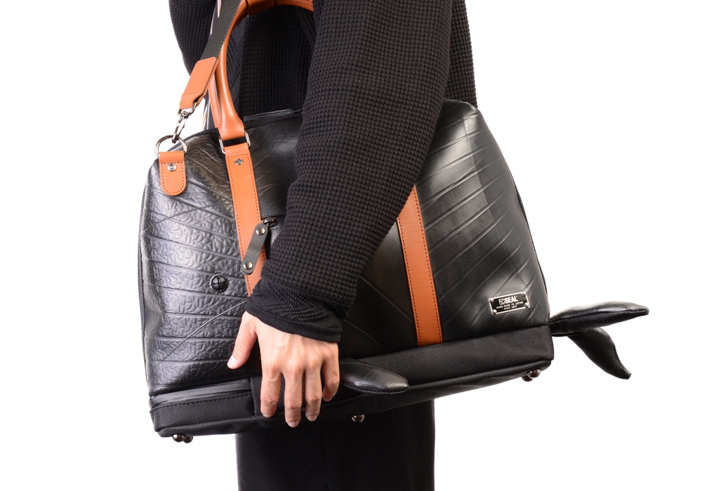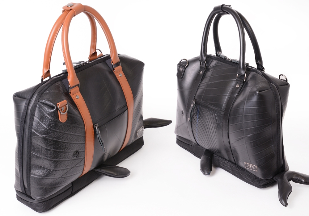 タイヤチューブの曲線や質感を活かし、国内職人の熟練した手作業により実現したアート作品のような、愛らしくもしっかりと表現された遊び心溢れるビジネスバッグが完成しました。ビジネスバッグとしての機能性や収納面も優れ、尾尻や背びれが付いているなど細部までこだわりをもってつくられた製品です。廃材の持つ防水性・耐久性により突然の雨などの過酷な環境でもしっかりと内部を守り、ありきたりなビジネスバッグではなく他の人とは違うビジネスバッグを持ちたい方、またはデイリーユースでもノートPCやモバイル機器を持ち歩く事の多い方でもしっかりと活躍するアイテムです。