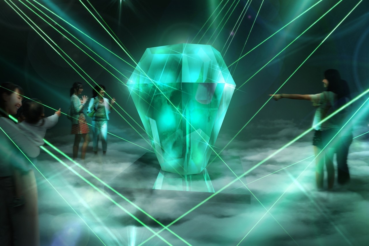 エメラルドの宝石箱 :緑色に輝くエメラルドの光が飛び交う幻想の空間。