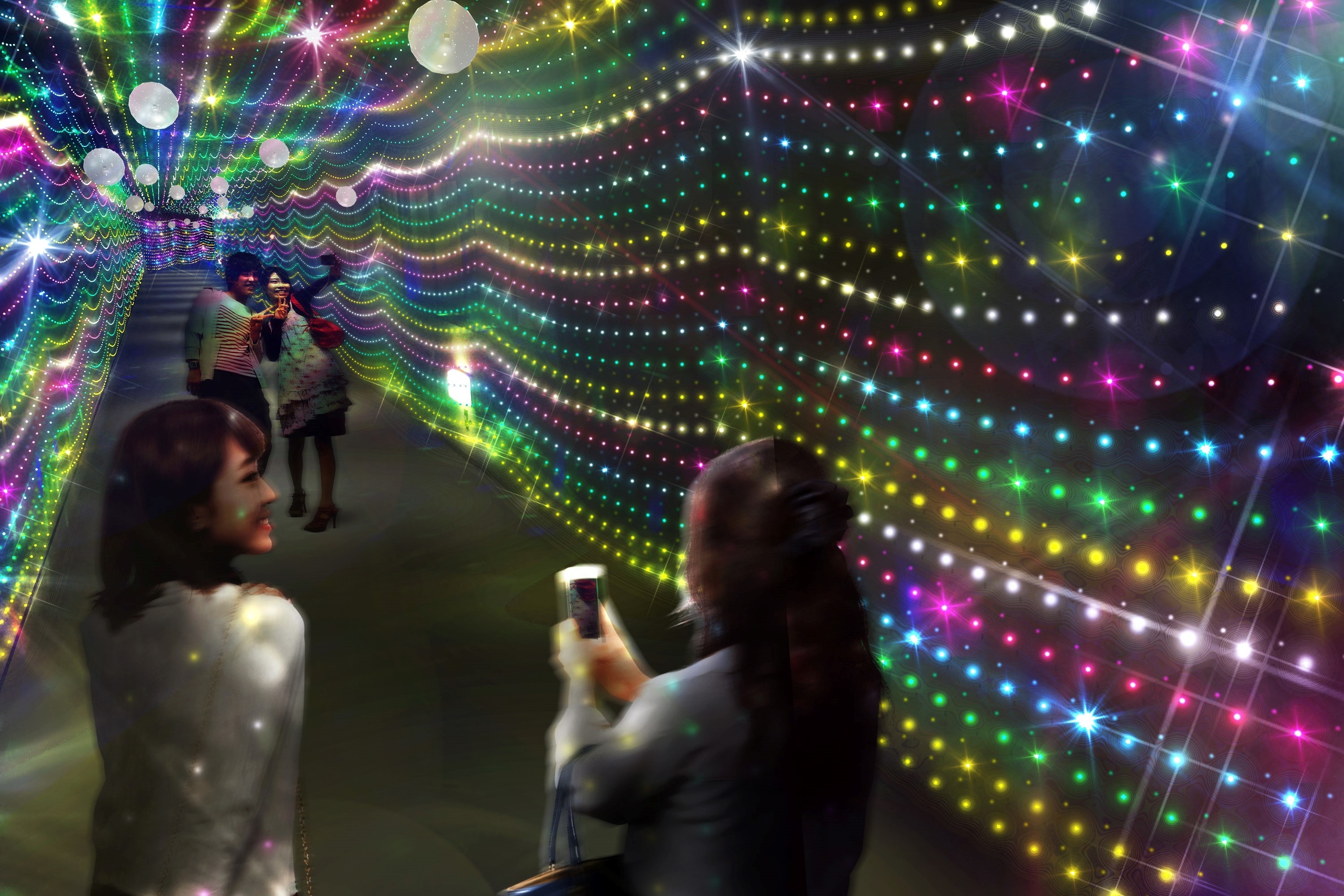きらめく宝石のような色とりどりの光の粒に包まれて歩く、まばゆい光の道。