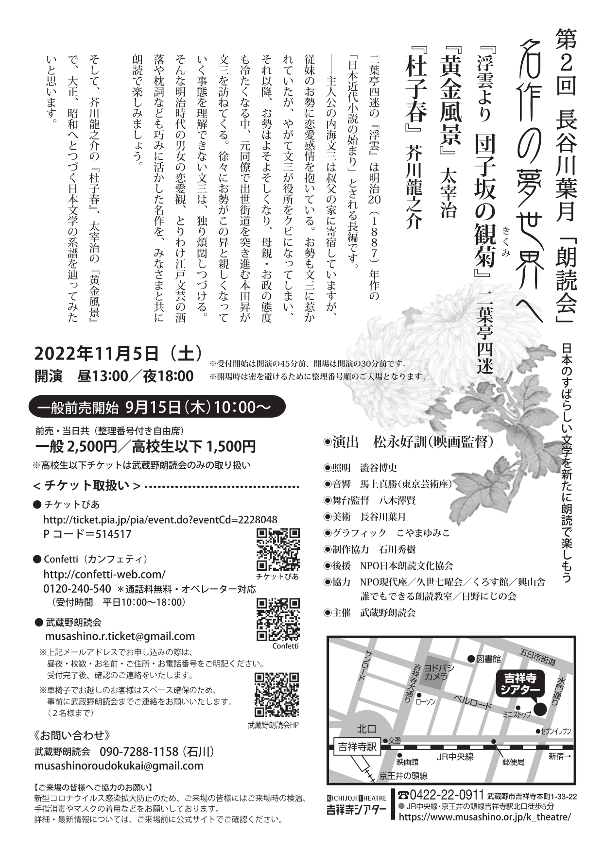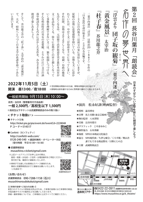 武蔵野朗読会主催、『第2回 長谷川葉月朗読会 ~ 名作の夢世界へ ~』が2022年11月5日 (土)に吉祥寺シアター(東京都武蔵野市吉祥寺本町1丁目33番22号)にて上演されます。