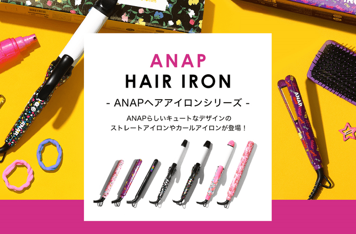 現在発売中の「ANAPヘアアイロンシリーズ」は全7アイテムで、様々なスタイルに対応できるラインナップとなっており、ANAP らしいポップなデザインとなっております。
