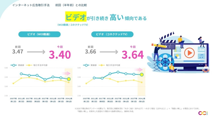 取引手法別でみると、ビデオ(WEB動画・コネクテッドTV)での数値が引き続き高く、継続して予算増の傾向にあることがわかる。