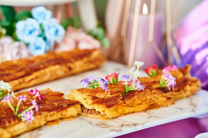 ラプンツェルの姿が描かれたレアチーズタルト、王子様との甘酸っぱい恋の味をイメージした苺のモンブラン、たくさんの花々に彩られたロールケーキ・シフォンケーキなどのスイーツに加え、編み込まれたパイ生地が特徴的な三つ編みミートパイ、根菜とチキンミートボールのトマト煮込み、たっぷりチーズのスパイシードリアなど、お子様から大人まで楽しめる約20種類のお料理&スイーツをお好きなだけご堪能いただけます。