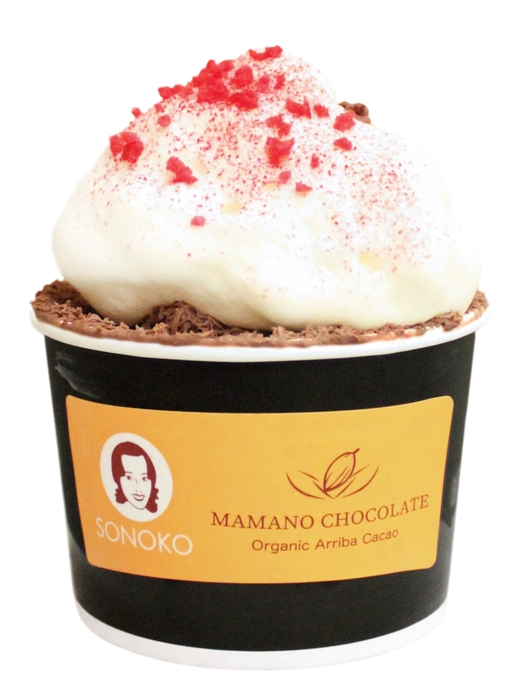 SONOKO製品のアイスクリームやフレーバーソースが染み込んだスポンジケーキと食感が良く香ばしいカシューナッツクッキーとのマリアージュが楽しめます。神様のチョコレートと言われるオーガニックアリバカカオ専門店「MAMANO CHOCOLATE(ママノ チョコレート)」のチョコレートがコラボレーションした、アリバカカオチョコレートの「新感覚チョコレートフラッペ」です。