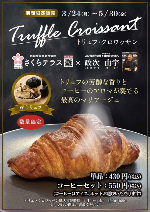医療法人医誠会(本社:大阪府大阪市、代表者:谷幸治)が運営する医誠会国際総合病院に併設されたヘルシーカフェ「さくらテラス」は、2024年3月24日から5月30日まで、料理人・政次由宇氏とコラボレーションした「トリュフ・クロワッサン」を期間限定・個数限定で販売しています。香り高いトリュフを贅沢に使用し、毎週10個のみ販売される希少なクロワッサンは、政次由宇氏のファンはもちろん、近隣の方や病院をご利用の方にもぴったり。コーヒーとのお得なセットもご用意しています。