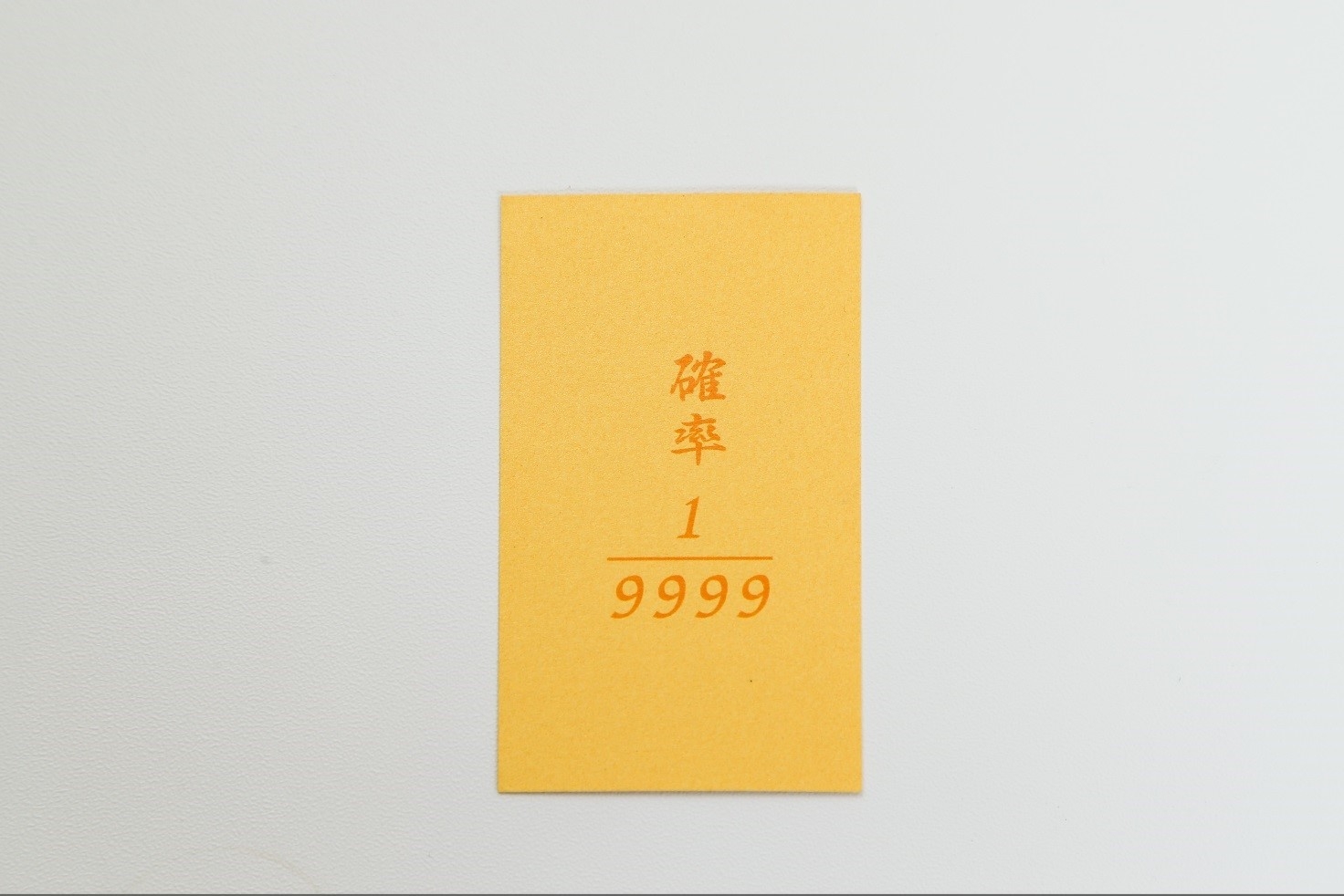 鯉の滝登りをイメージする金箔風絵柄、9999個を突破するごとに1枚ずつ封入する“超”幸運なアイテムです。製造スタッフ1名が気まぐれに封入するため、販売スタッフや代表スタッフさえ何も知りません。