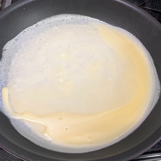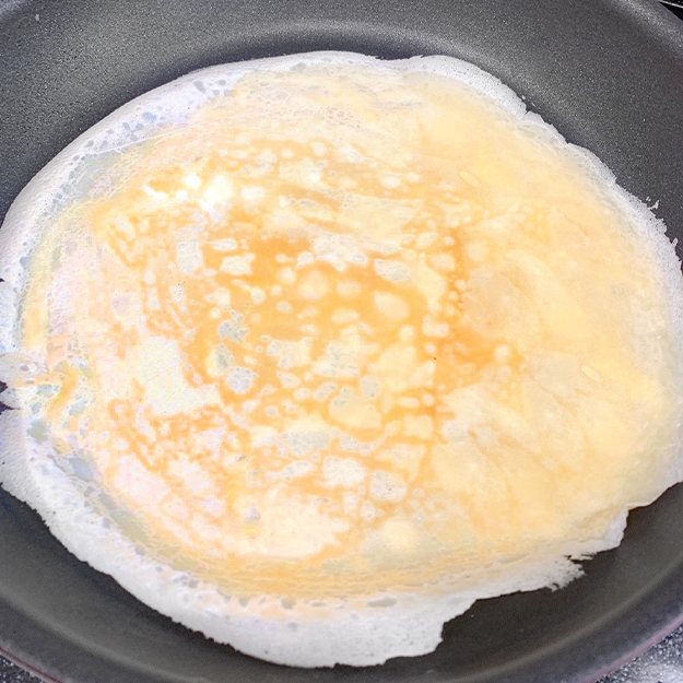 - フライパンにサラダ油をひき、弱火にして「2」を流し入れ、薄く広げる