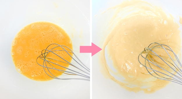 - ボウルに卵を割り入れ、溶いたら【材料A】をふるいに入れて混ぜ、さらに溶かしバターを加えて混ぜる