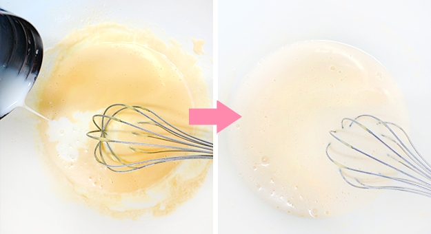 - 牛乳を少しずつ加えて混ぜ合わせ、均一に混ざったら、ラップをかけて冷蔵庫で20分休ませる