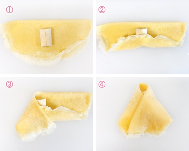- 「4」の生地を半分に折り、中央にバナナを置く。