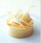 素焚糖のキャラメルムースとバニラババロアの組み合わせ。サクサク食感のホワイトチョコがけのフィヤンティーヌがアクセント。