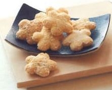 国産のもち米生地を揚げ、素焚糖と粉糖をまぶした桜のモチーフのおかき。