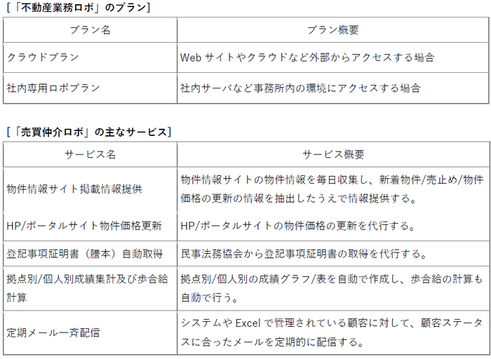 今回、提供開始するサービスの目的は、売買仲介会社様の定形業務に特化した「売買仲介ロボ」で業務を代替することにより、パッケージ、Web、ノンコア業務支援を統合化し、不動産実務を支援することです。また、今後ユーザー企業様のニーズやご要望を吸収しながら、「不動産業務ロボ」シリーズのサービスを拡充してまいります。