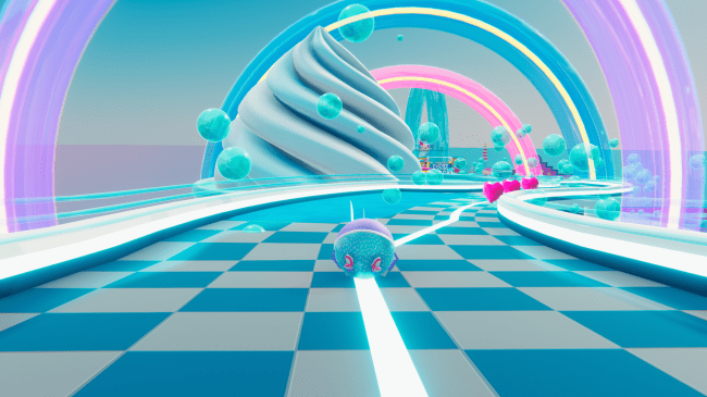 ボールのように丸いキャラクターが、デートの待ち合わせ場所に向かうため80年代風の仮想空間の街並みを走ったり転がったりしながら進んでいきます。