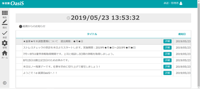 残業抑制やノー残業デー、また全社休日など、社員へのお知らせを表示することが可能です。