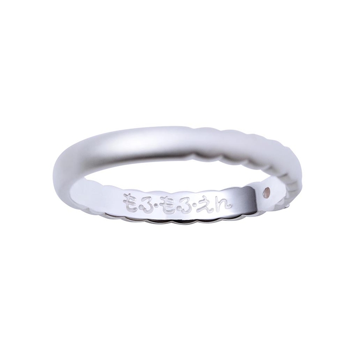 表面はもふもふをイメージした柔らかなフォルムをデザイン、中央にはユニットカラーストーンをセットし内側にはユニット名を刻印しました。もふもふえんの世界観を取り込んだマット加工のデザインです。