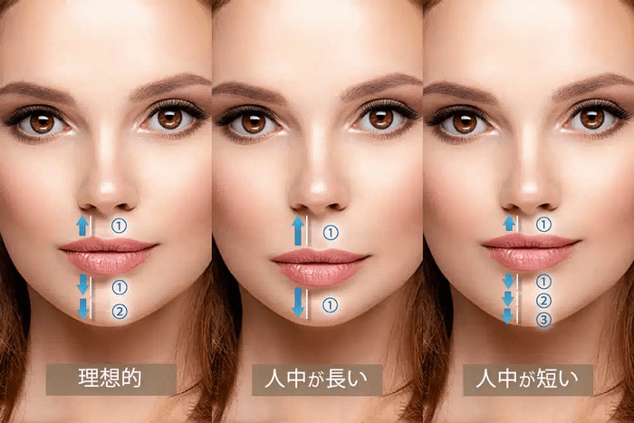 鼻と唇の間の溝を指します。一般的には鼻下から上唇の長さと下唇からあご先の比率 が1:2であることが「黄金比」とされ、それに近いほど魅力的な顔とされています。そのため人中を短くしただけでは、美しくなるわけではなく、顔全体のバランスが非常に重要です。また、人中は加齢に伴って表情筋がゆるみ、鼻下が伸びてしまうこともあるため、人中を短くすることで若見えするとも言われています。