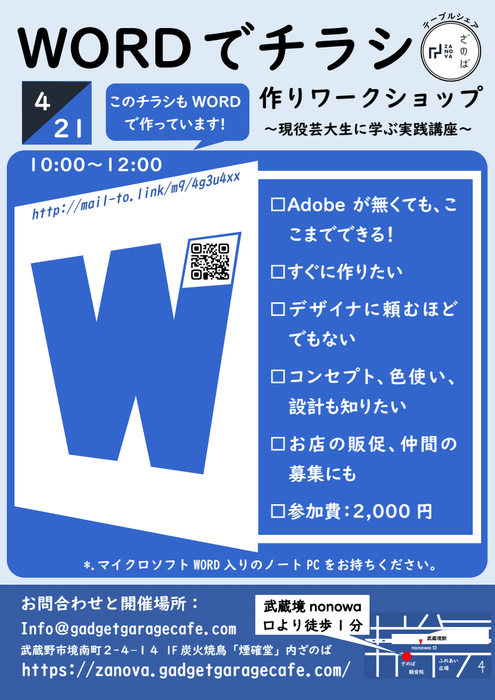 「デザイナさんごめんなさい!簡単にwordでチラシが作れちゃう」ワークショップが武蔵野で開催されます。『WORDでチラシ作りワークショップ』は、デザインソフトに頼らず、簡単にプロっぽいチラシを作成できる技術を提供します。このセミナーでは、マイクロソフトWORDを使用して、誰もが短時間で効果的な販促物を作り出せる方法を学びます。2024年4月21日、炭火焼鳥 煙確堂 内テーブルシェアざのばにて、このワークショップが開催されます。