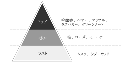 吟醸香のフルーティで華やかな香りから、舞い踊る花びらに乗って漂う桜の甘さが広がり、上質なムスクが微酔を帯びたように心地よくフェードアウトしていく儚げな香りです。お花見の季節、美しく咲き誇る桜を愛でながら、日本の美しさを香りでもお楽しみいただけます。