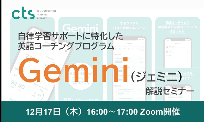 企業向け語学研修の株式会社シー・ティー・エス(本社:大阪府大阪市北区、代表取締役:岩名 葵、以下、CTS)は、自律学習サポートに特化した英語コーチングプログラム「Gemini(ジェミニ)」をリリースいたしました。これに伴い、本プログラムのコンセプトや詳細内容をご紹介する「Gemini解説セミナー」を12月17日(木)16:00よりオンラインで開催致します。