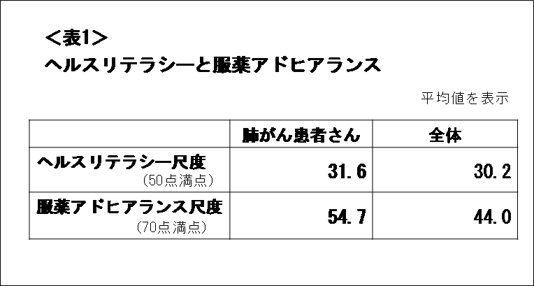 肺がんの患者さんは、一般生活者に比べて、ヘルスリテラシーや服薬アドヒアランス(治療意欲、積極的な薬物治療への参加)のスコアが高くなっている。<表1>