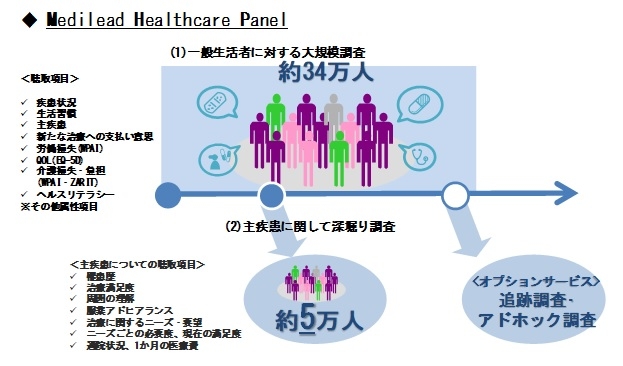 株式会社クロス・マーケティンググループ(本社:東京都新宿区、代表取締役社長兼CEO:五十嵐幹、東証一部3675)のグループ会社である株式会社メディリード (本社:東京都新宿区、代表取締役社長:亀井晋、以下当社)は、2018年調査に引き続き全国の男女を対象に「Medilead Healthcare Panel(以下「MHP」)構築調査」を実施し、一般生活者約34万人の疾患情報パネルを更新しました。本パネルは直近一年以内に入通院歴のある方約13万人、同期間に入通院歴のない方約20万人で構成されており、アンケートパネルとして利用できるだけでなく、インサイト獲得を目的としたコホート研究(集団の追跡)などの縦断研究における分析にも十分に耐えうる疾患情報パネルとして、国内最大規模となります。また、2018年に引き続き回答を得られた方は約14万人であり、この14万人については2018年との比較が可能です。