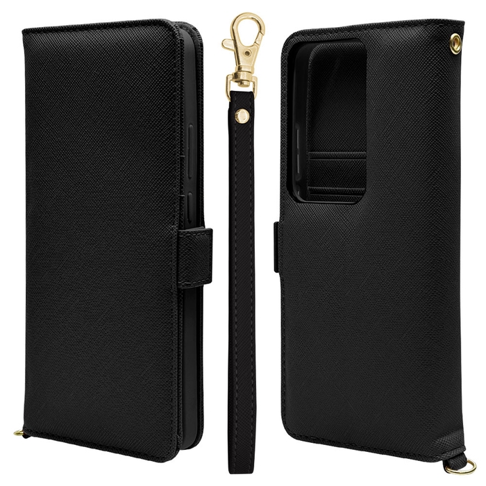 本製品は液晶画面側と背面側の両面を保護できるハンドストラップ付きの手帳型ケースです。