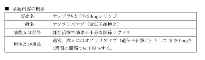 関節リウマチ治療薬「ナノゾラ®皮下注30mgシリンジ」の 国内製造販売承認取得のお知らせ | NEWSCAST