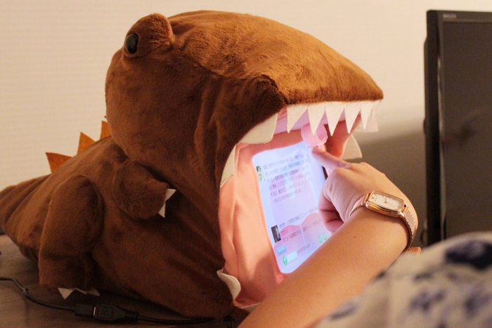 恐竜のぬいぐるみ(ティーエスティーアドバンス株式会社製作)を纏った、タッチパネル型ロボット。