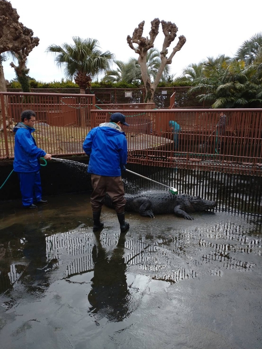園内の大掃除の一環として始まり、いつもの掃除に比べ、より丁寧に、池の苔や汚れを落とすと同時に、ワニの背中の汚れも落とし、新年を迎える準備をいたします。