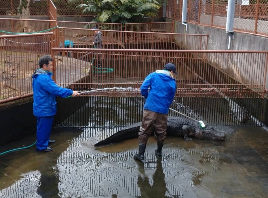 朝7時頃から池の水を抜き始め、開園時間の9時より、池の底や側面の掃除から始め、その後、ワニの背中の汚れを落とすためのブラッシングを開始いたします。