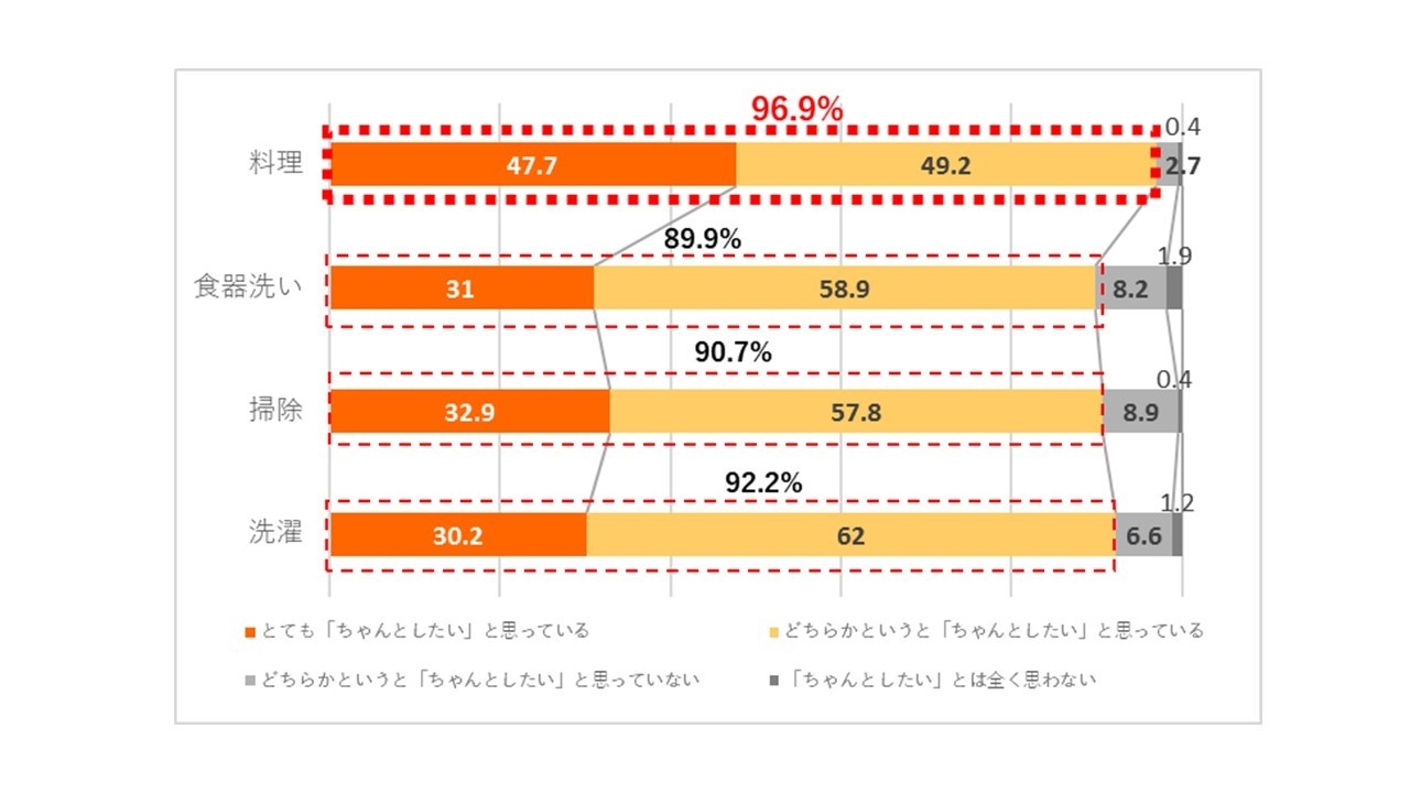 調査対象の有職既婚女性に、負担に感じている家事について聞いたところ、「料理」と回答した人が69%と最も多く(図1)、また、ちゃんとしたいと思っている家事について尋ねたところ、97%近くの人が「料理」を挙げました(図2)。