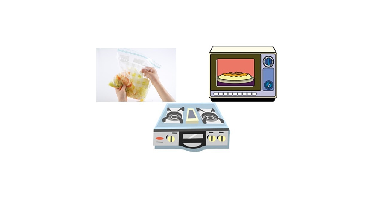 (2) コンロ2つで主菜の炒め物や煮物(汁物)、電子レンジで副菜を作ります。もう1品は保存バッグで作る和え物や、冷蔵庫から取り出して盛り付ける程度のもの(週末のカンタン作りおき)で構成すれば加熱待ちのロスも防げます。