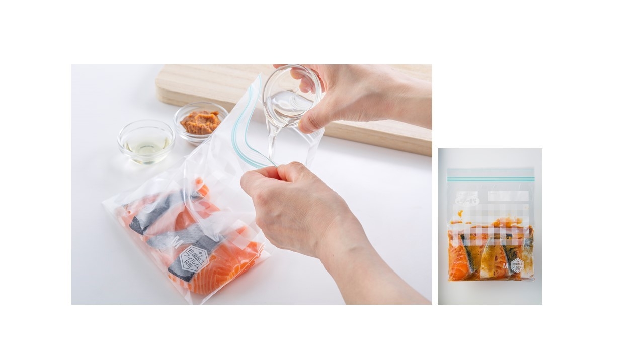肉や野菜は、調味料と一緒に保存バッグに入れて冷凍・冷蔵を。肉や魚が柔らかくしっとりして味わいやすくなる。