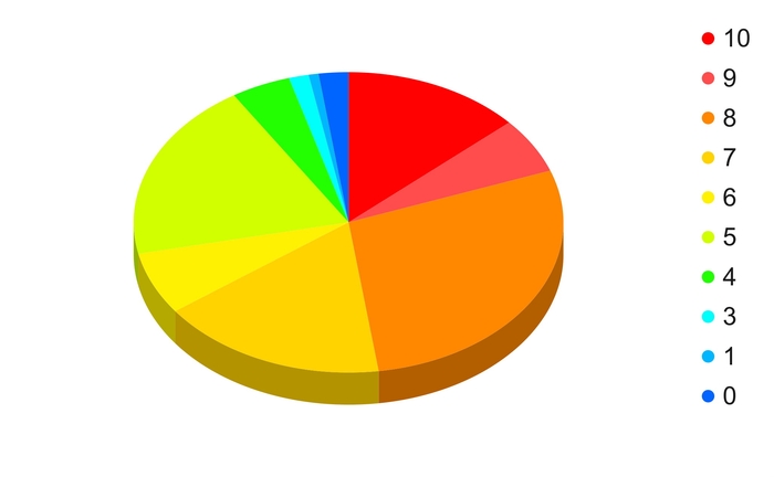 1位は「8(38件)」で、全回答者の28.4%が回答しました。ついで2位は「5(26件)」19.4%、3位は「7(23件)」で17.2%、4位は「10(18件)」で13.4%、5位は「6(9件)」で6.7%。