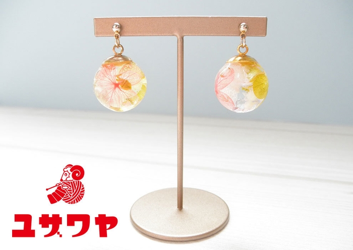 レジンとは透明な樹脂の中にキラキラしたビーズやラメ、パーツなど、好きなものを詰め込んで固め作ることができる手作りグッズで人気の素材。この「レジン」や「ハーバリウム」のピアスやイヤリングを作成体験して頂きます。