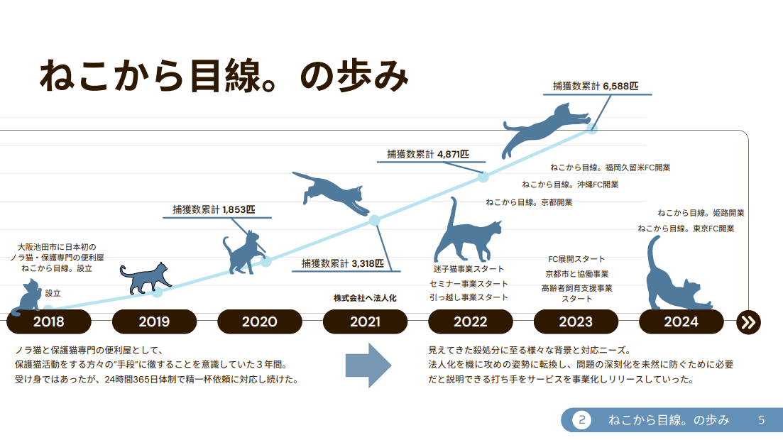 「ねこから目線。」は猫の殺処分ゼロを目指し、2018年に設立された「ノラ猫・保護猫専門のお手伝い屋さん」です。「猫の問題は、人の問題でしかない。」という視点から猫の問題を解決する目的で、対人援助学を学んでいた小池 英梨子により設立されました。以来、猫にメリットがあると考えられることであれば、なんでもお手伝いしてきました。2021年に株式会社化し、猫の課題解決のために必要だと説明できるサービスに特化し、事業展開しています。