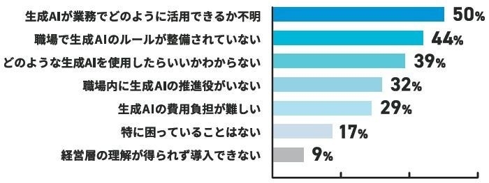 ・企業・事業主では、「生成AIが業務でどのように活用できるか不明」が50%、「職場で生成AIのルールが整備されていない」が44%。次いで、「どのような生成AIを使用すればよいか分からない」、「費用負担」などに課題