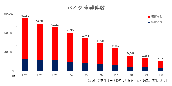 実は、盗難防止アイテムの機能性向上などのさまざまな理由により、バイクの盗難被害件数は9年間で約5分の1に減少しています。「それなら、そんなに心配しなくてもいいのでは?」と思う方もいらっしゃるかもしれません。しかし、現在でもバイクは1日に約42台が盗難被害にあっており、施錠していたにもかかわらず、多くの被害が発生しているという結果が出ています。では「盗難被害にあっても仕方ない」と諦めるしかないのでしょうか?