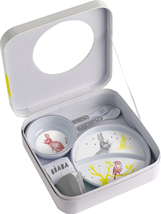 スプーン、フォーク、プレート2枚、カップ、ビブがかわいいボックスに入ったギフトミールセット