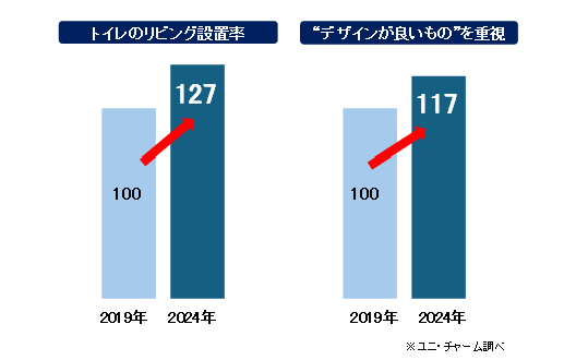 近年、猫用排泄市場では、消臭力とお手入れの簡便性が評価され、「システムトイレ」が普及しています。中でも、『デオトイレ(R) らくらくシンプル』は、「猫が慣れやすい設計」「ケージにも置けるコンパクトなサイズ」「手入れが簡単」といった特長が支持され、2024年3月発売以降、多くの飼い主様にご愛用いただいています。一方、システムトイレのリビングへの設置率が約1.3倍※(2019年比)に拡大していることから、インテリアに調和するデザインを求める飼い主様も約1.2倍※(2019年比)に増加しています。
