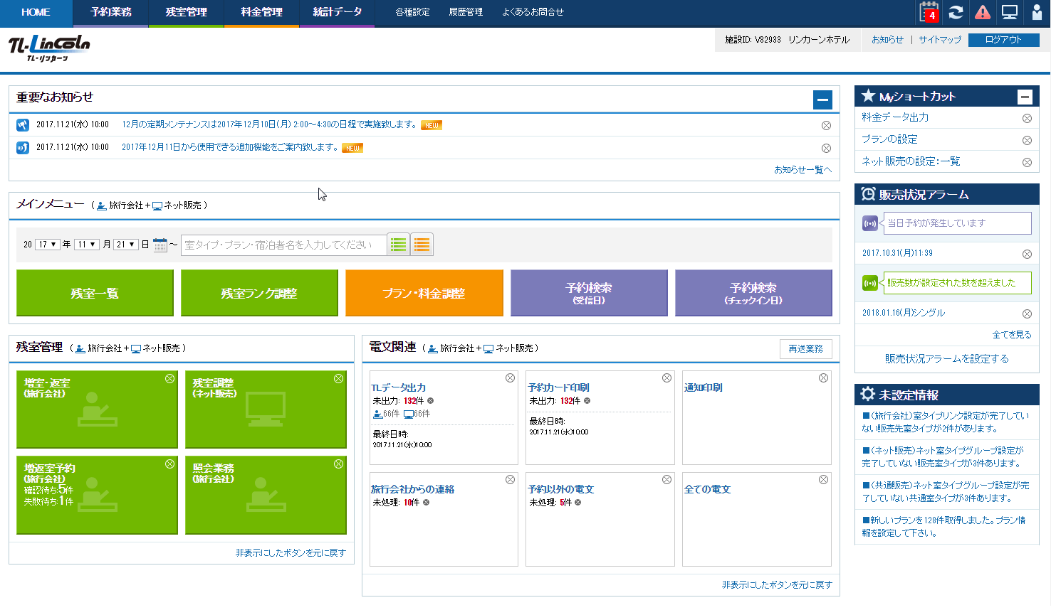 宿泊施設向けの予約・販売管理システムTL-リンカーンは、旅行会社とネット販売からの通知を一元管理し、残室・料金調整が一括でできるASPサービス。ネット販売は複数の管理画面を個々に開いて管理する必要がなくなるため、オーバーブッキングを回避し、販売機会を最大限広げることができます。またホテルシステム(PMS)とのデータ連携も可能なため、通知情報の手入力、転記等の業務負荷も軽減。業務改善と増売を同時に実現することができます。