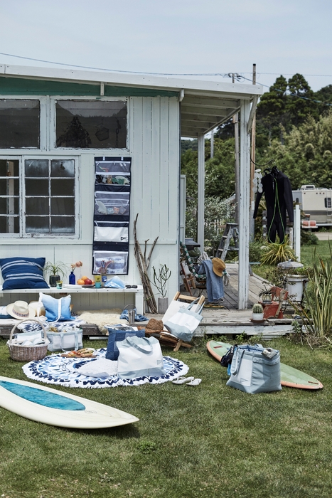JACKとMARIEの(J&M’S)体現する「Slow life × Surf」を彷彿とさせる、青(BLUE)を基調としたバッグや、タンブラーやグラスなど、ビーチキャンプに最適なカトラリー、ナチュラルテイストなキータグなどを展開します。