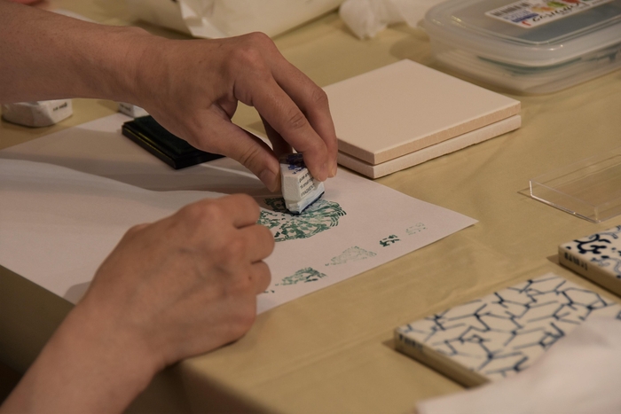 ワークショップでは、谷田研究室が分業されているタイルの各製造工場で採取した模様や陶片の模様からカケラ模様のスタンプを54個作成。村橋さんが海や川で偶然出会う陶片と同じように、くじ引きで引き当てたスタンプ3個を使ってタイルのデザインを考える方法となりました。参加者は模様の組み合わせや押す位置をどうるか試行錯誤しながら、“Peace in One”な世界で1つだけのマイタイル作りを楽しみました。